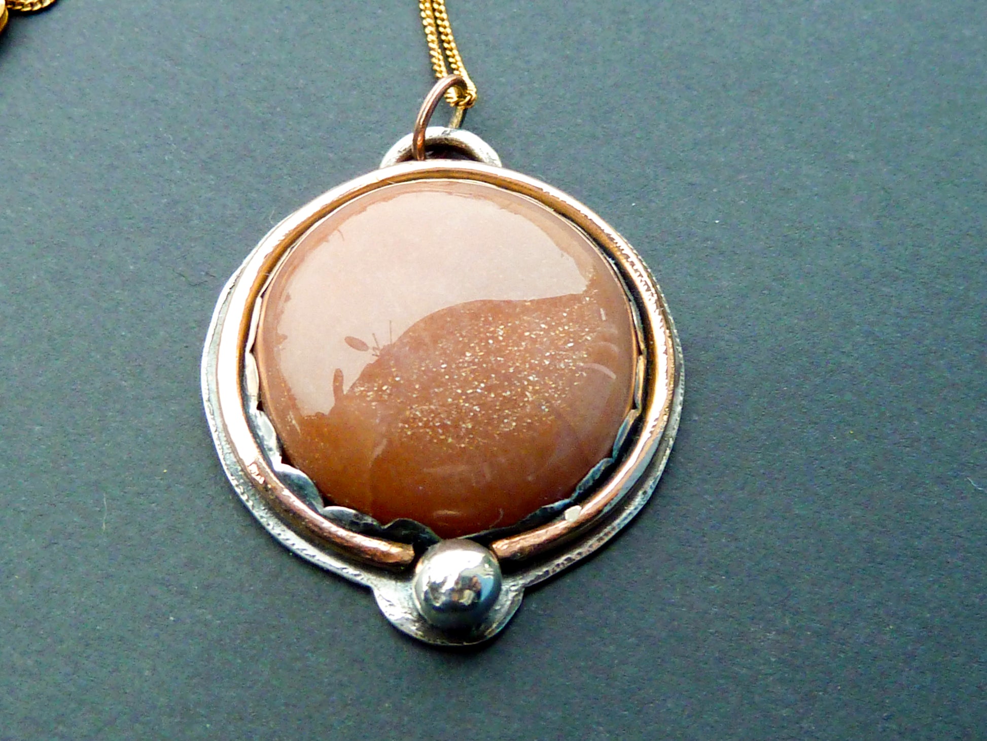This pendant carries a soft shimmer — a single peach moonstone that catches the light with quiet, glowing warmth. Rose gold and silver accents frame the stone, their gentle contrast giving the piece both delicacy and depth.