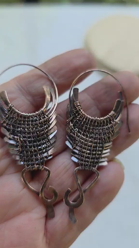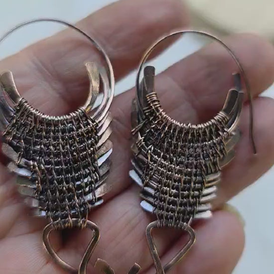 These sculptural earrings are a bold expression of handwoven copper, blending detailed wire weave with textured, curved metal forms in a shape that's both organic and edgy. Each earring is crafted using traditional wire weaving techniques, where fine copper wire is meticulously wrapped and layered to build intricate structure, then finished with hammered, antiqued copper curls that make these earrings truly one-of-a-kind.